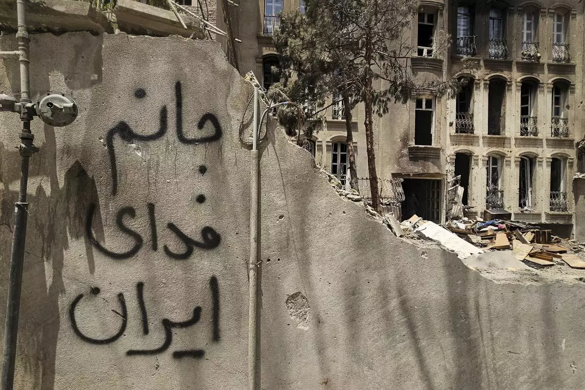 The phrase "My life for Iran" is spray-painted on the outer wall of a residential building heavily damaged by a missile strike in Tehran, Iran, Friday, June 27, 2025. (AP Photo)