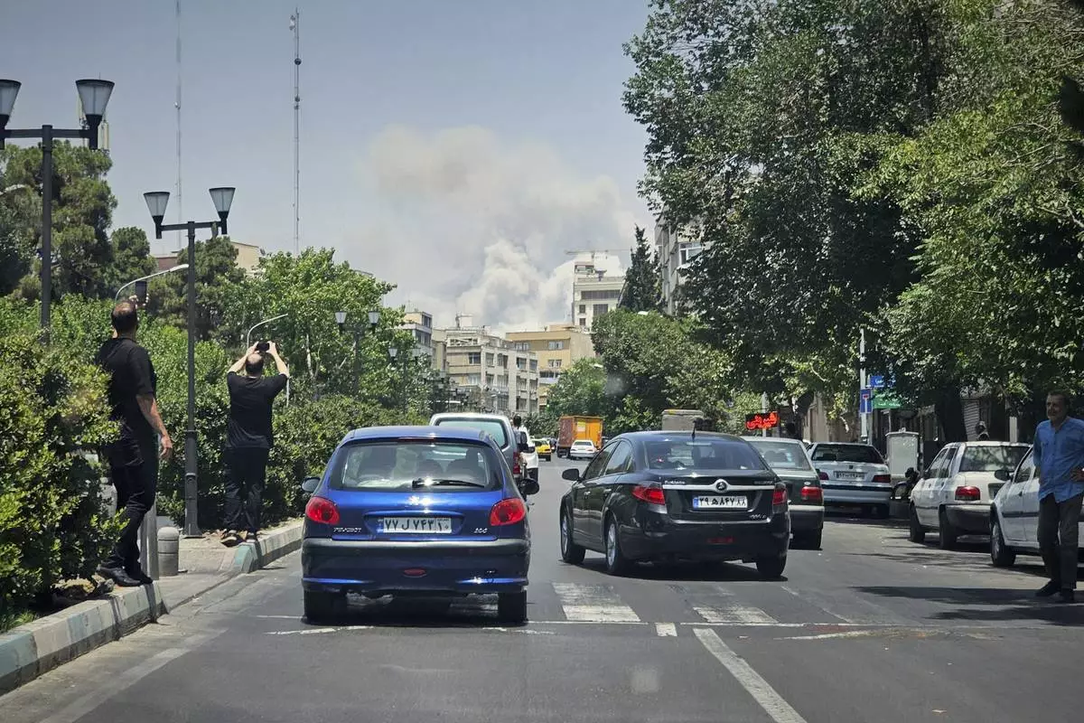 With their cellphones, residents take pictures of smoke rising from an Israeli strike in Tehran, Iran, Monday, June 23, 2025. Repeated explosions echoed across the city as plumes of smoke rose from multiple locations.(AP Photo)