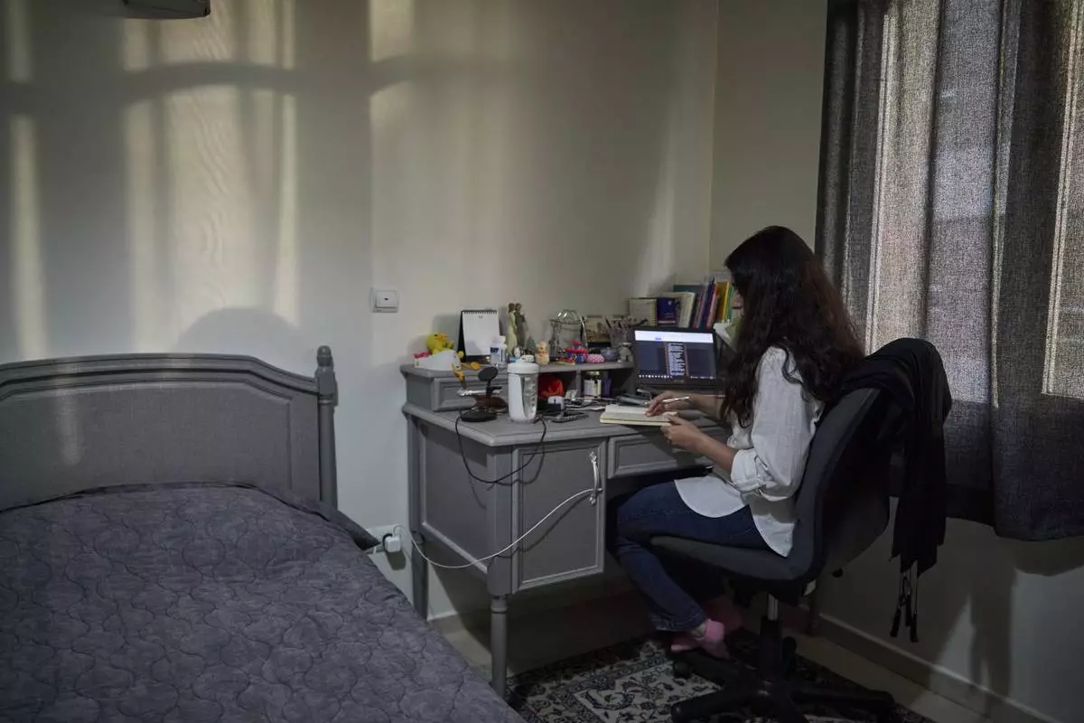 Mastaneh submits an exam online from her home in Tehran, Iran, where she lives with her mother, Maryam, Wednesday, June 25, 2025. She hadn't returned to campus since the start of the 12-day war between Iran and Israel.(AP Photo)