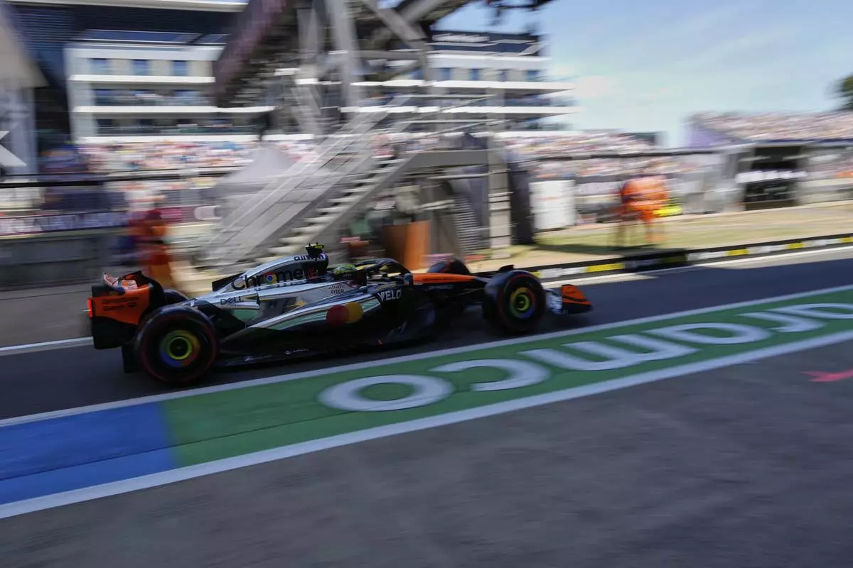 McLaren driver Lando Norris of Britain exits the pit lane during the first practice of the British Formula One Grand Prix in Silverstone, England, Friday, July 4, 2025. (AP Photo/Darko Bandic)