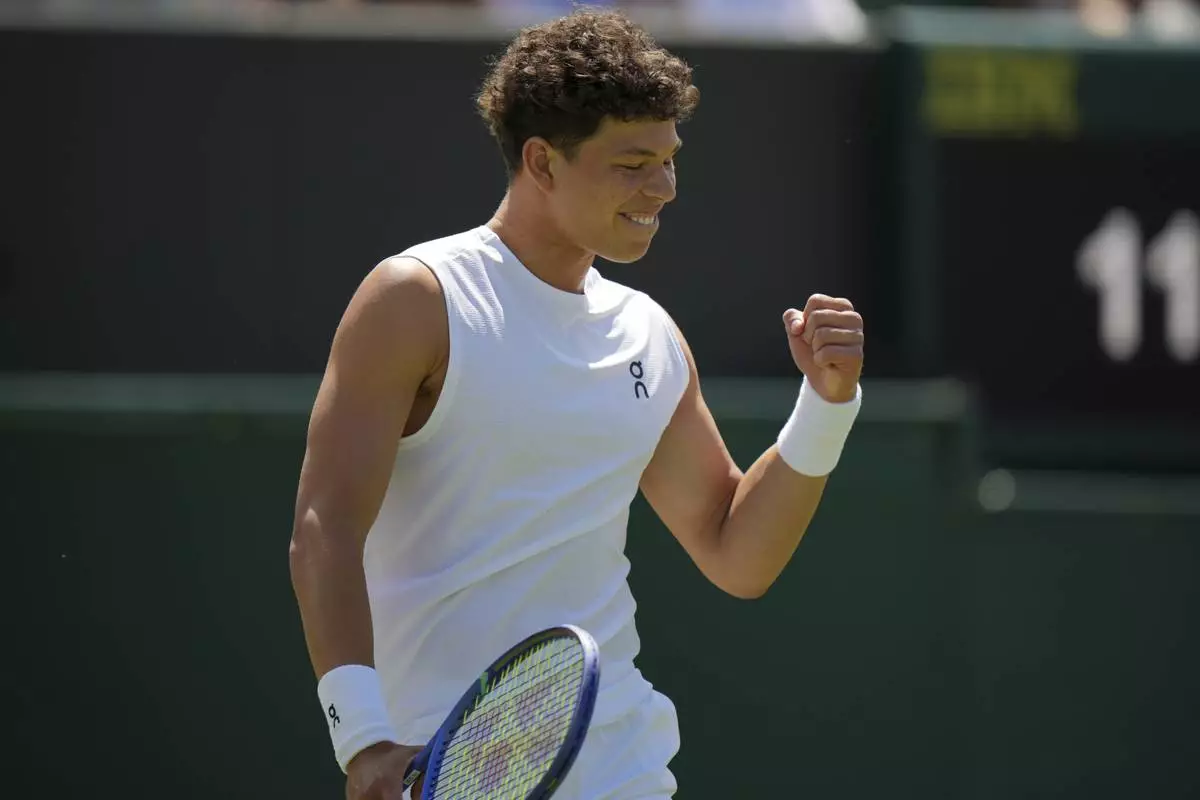 LONDON (AP) — Four points. Three aces. About a minute. That's all it took for Ben Shelton to wrap up a 6-2, 7-5, 6-4 victory over Rinky Hijikata on Friday in a second-round Wimbledon match suspended the night before because of darkness at 5-4 in the third set.