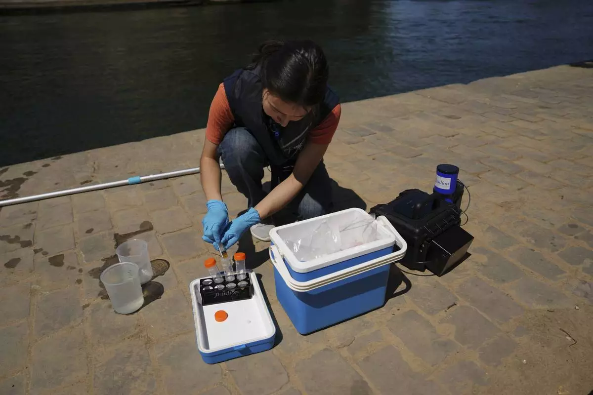 Emilie Vilana of Fluidion takes a sample from the Seine river to test the water quality, Thursday, July 3, 2025 for the opening of the three Seine swimming pools during the 'Paris Plages' event from July 5 to Aug. 31 in Paris. (AP Photo/Aurelien Morissard)