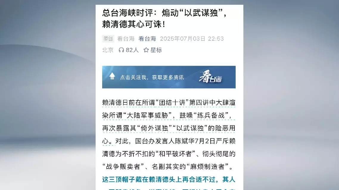 Under the pretext of the so-called "mainland threat," Lai attempted to deceive the military and people in Taiwan into fighting for his political self-serving interest and separatist obsession.
