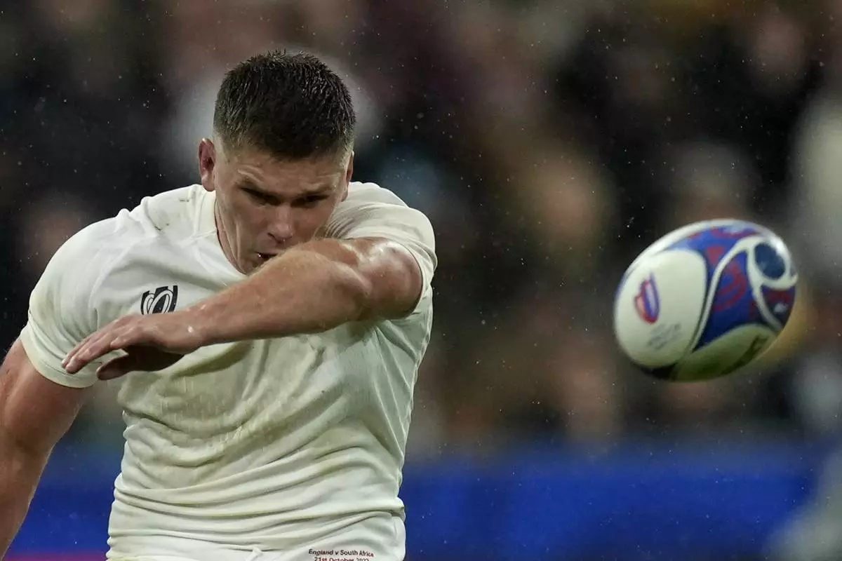 FILE - England's Owen Farrell kicks the ball during the Rugby World Cup semifinal match between England and South Africa at the Stade de France in Saint-Denis, outside Paris, Oct. 21, 2023. (AP Photo/Thibault Camus, File)