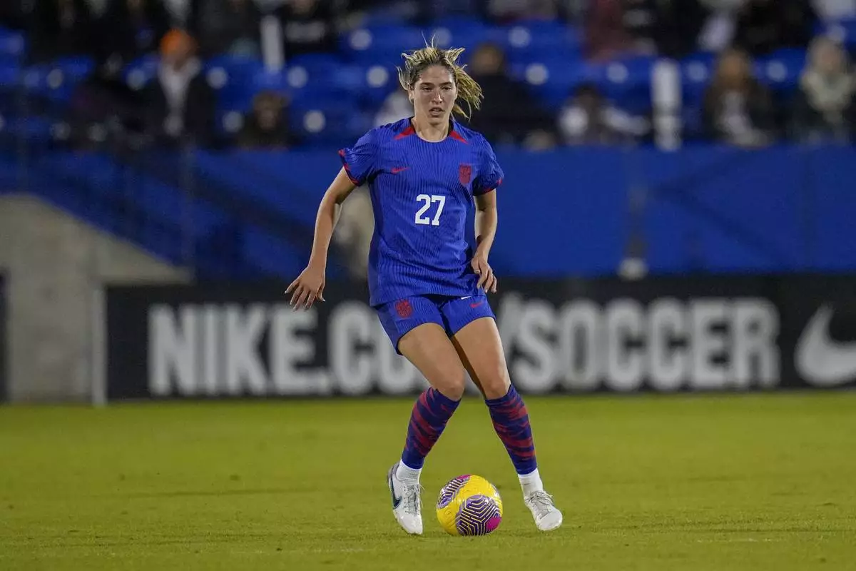FILE - United States' Korbin Albert participates in the second half of a women's international friendly soccer match between the United States and China, Tuesday, Dec. 5, 2023, in Frisco, Texas. (AP Photo/Julio Cortez), File)