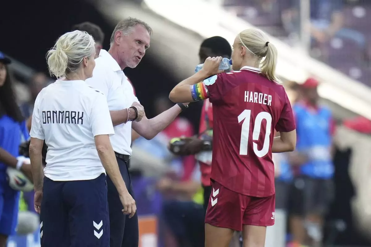 Denmark head coach Andree Jeglertz, left, speaks to Denmark's Pernille Harder during the Euro 2025, group C, soccer match between Denmark and Sweden at Stade de Geneve in Geneva, Switzerland, Friday, July 4, 2025. (AP Photo/Alessandra Tarantino)