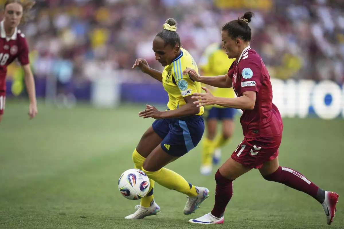 A free kick awarded for a foul against Denmark captain Pernille Harder was lofted toward the star forward who tangled with the falling Sweden winger Madelen Janogy. Harder was unable to control the ball which ran to safety toward Sweden goalkeeper Jennifer Falk.