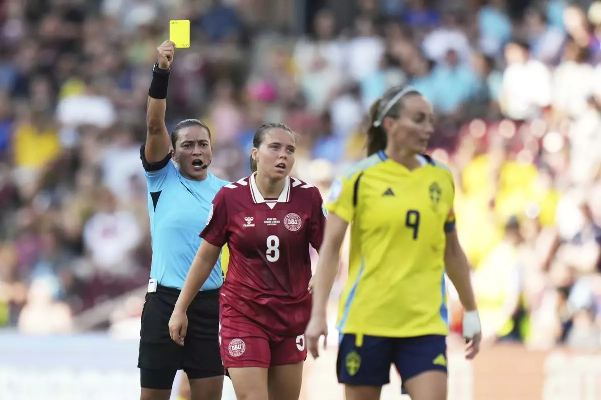 Referee Edina Alves of Brazil, shows the yellow card to Denmark's Emma Snerle during the Euro 2025, group C, soccer match between Denmark and Sweden at Stade de Geneve in Geneva, Switzerland, Friday, July 4, 2025. (AP Photo/Alessandra Tarantino)