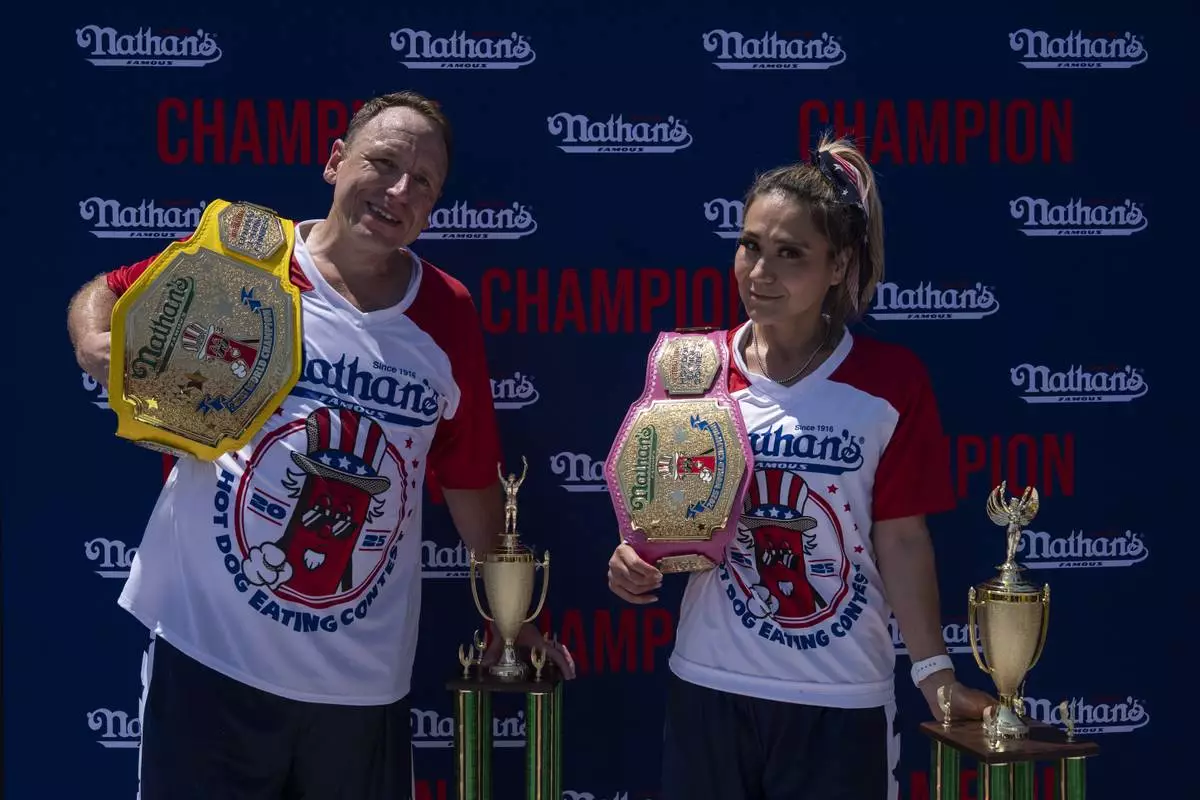 This year's woman's champion Miki Sudo, right, and man's champion Joey Chestnut, left, pose for a picture after the 2025 Nathan's Famous Fourth of July hot dog eating contest in the Coney Island section of the Brooklyn borough of New York, Thursday, July 4, 2025. (AP Photo/Yuki Iwamura)