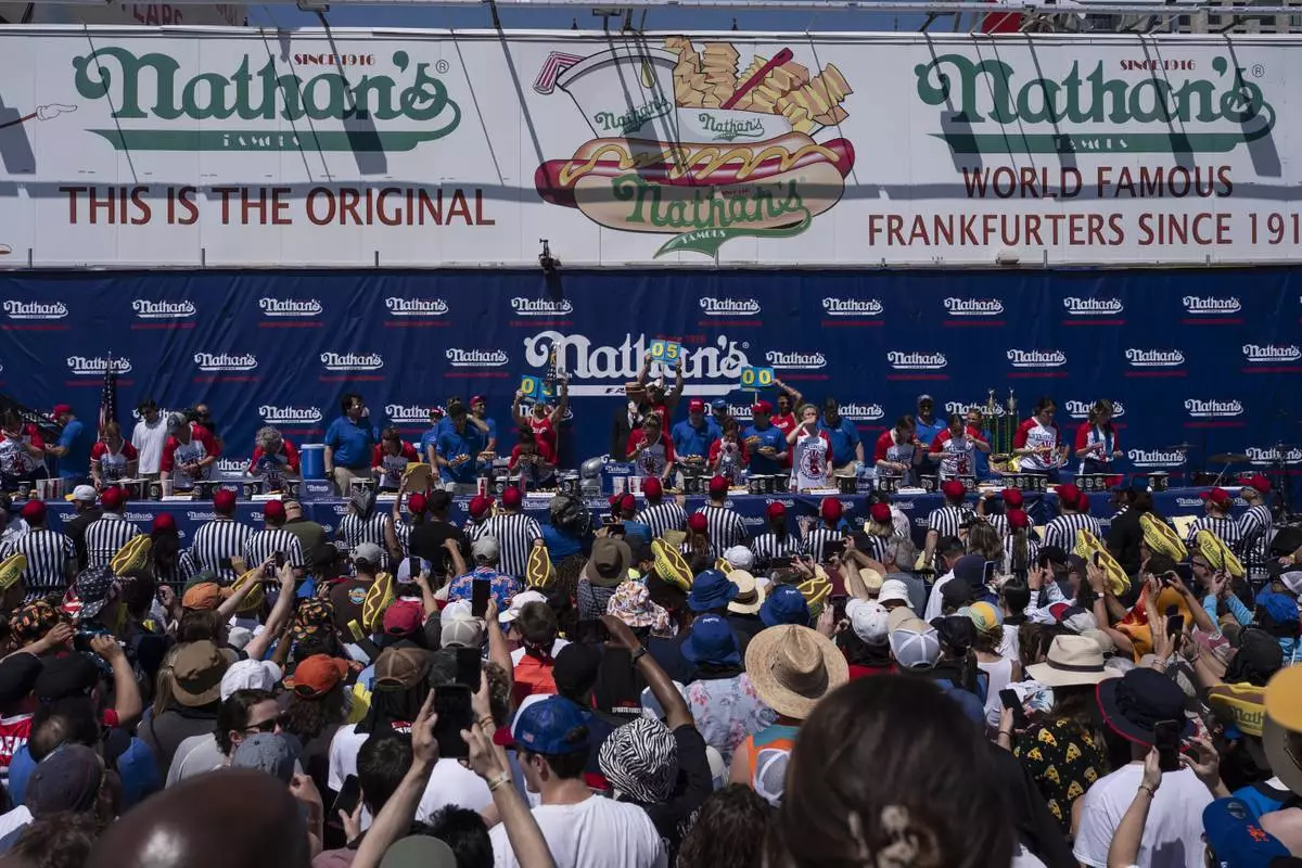 Competitive eaters eat hot dogs during the 2025 Nathan's Famous Fourth of July hot dog eating contest in the Coney Island section of the Brooklyn borough of New York, Thursday, July 4, 2025. (AP Photo/Yuki Iwamura)