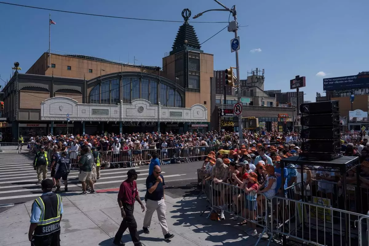 People gather ahead of the 2025 Nathan's Famous Fourth of July hot dog eating contest in the Coney Island section of the Brooklyn borough of New York, Thursday, July 4, 2025. (AP Photo/Yuki Iwamura)
