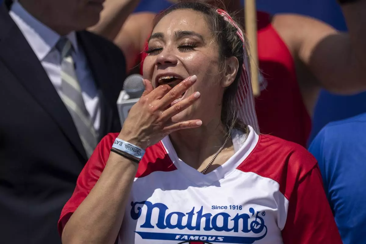 Competitive eater Dominica Dee eats hot dog during the 2025 Nathan's Famous Fourth of July hot dog eating contest in the Coney Island section of the Brooklyn borough of New York, Thursday, July 4, 2025. (AP Photo/Yuki Iwamura)