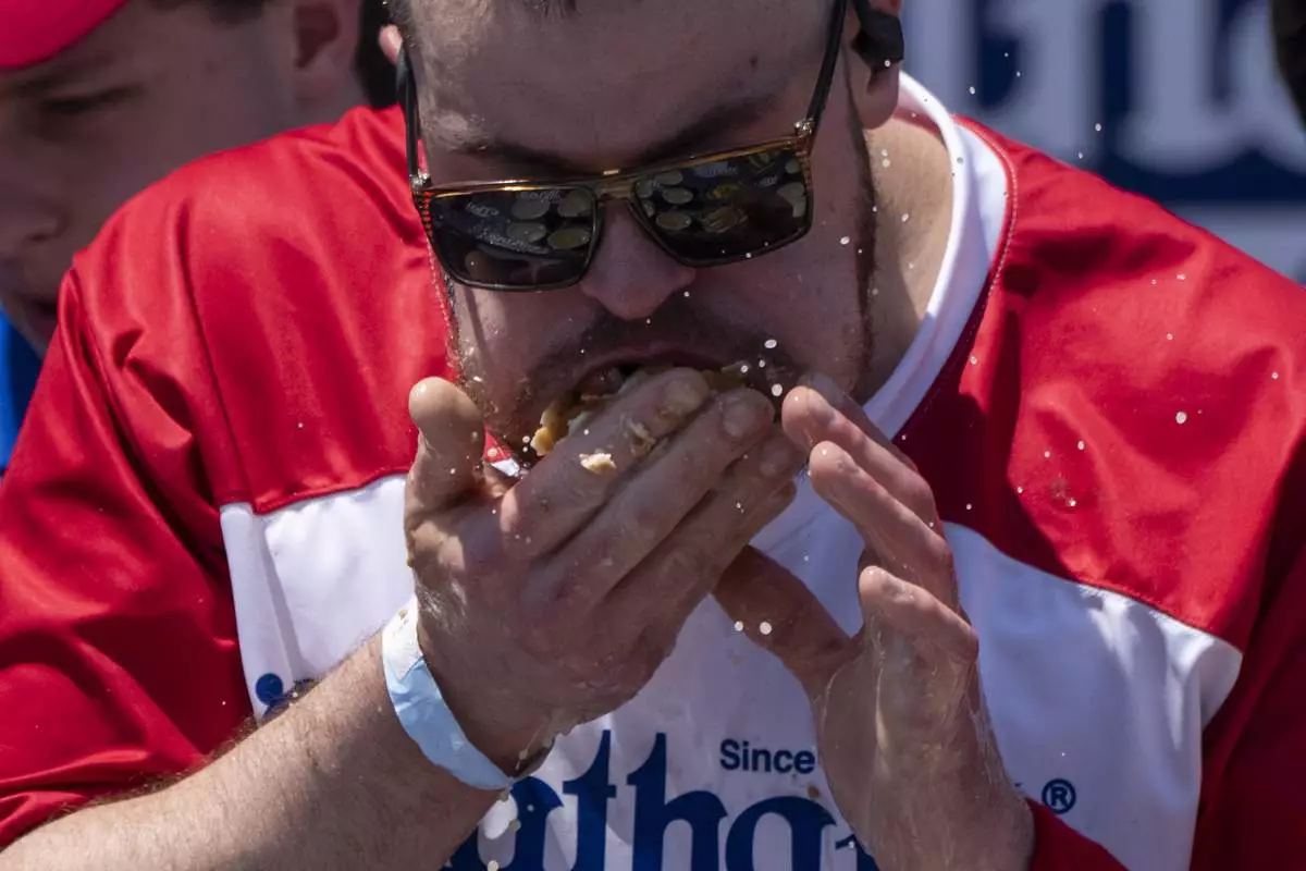 Competitive eater Patrick Bertoletti eats hot dogs during the 2025 Nathan's Famous Fourth of July hot dog eating contest in the Coney Island section of the Brooklyn borough of New York, Thursday, July 4, 2025. (AP Photo/Yuki Iwamura)