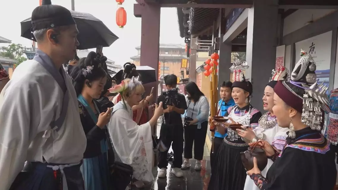 At the Duyun Qin-Han Film and Television City, the largest collection of movie studios in southwest China, delegation members dressed in the traditional clothing of the Han ethnic group, tasted local food, and experienced local ethnic minority arts, such as dancing with Lusheng, a folk musical instrument made of bamboo pipes.