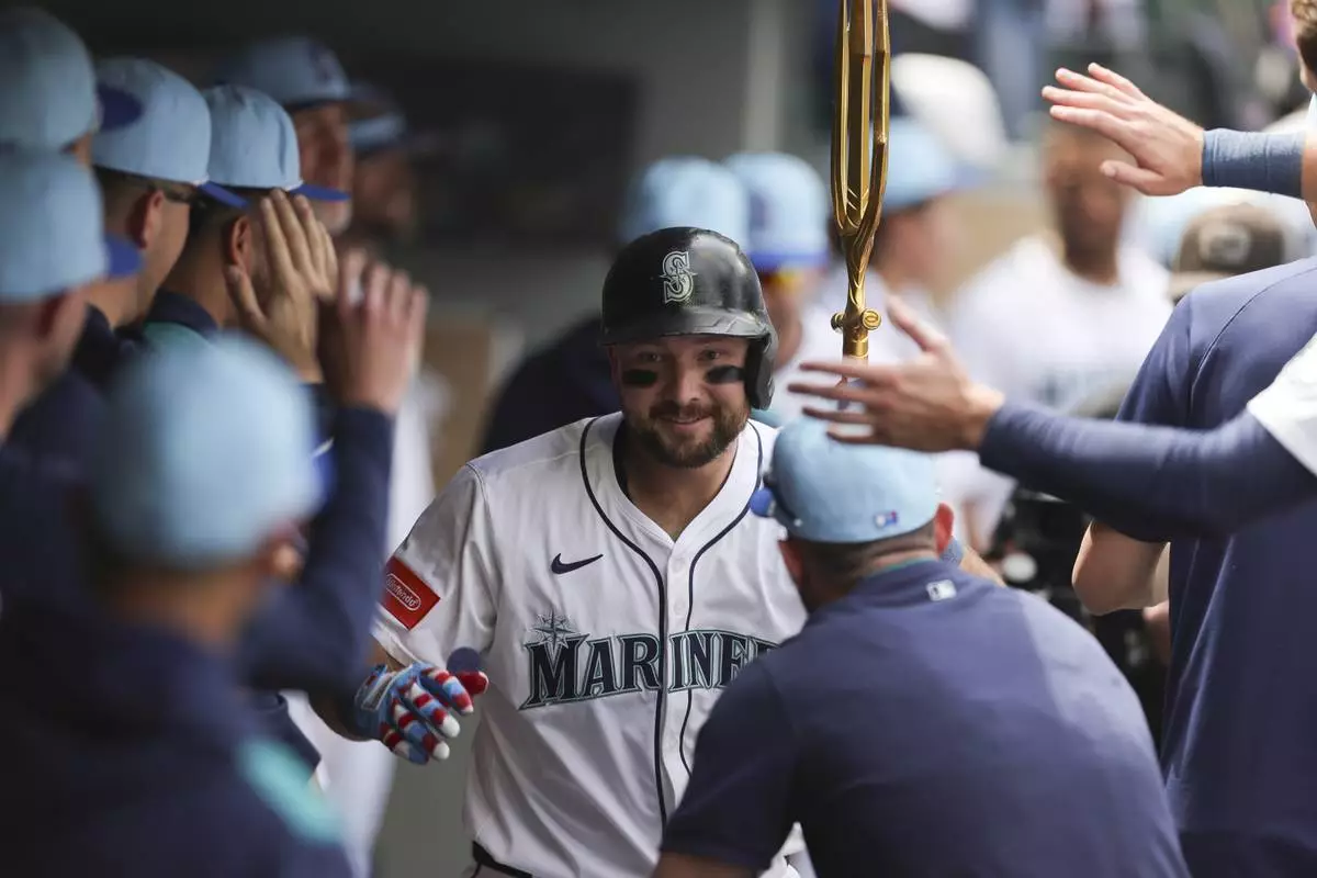 Seattle Mariners designated hitter Cal Raleigh, center, celebrates in the dugout after hitting a two-run home run during the first inning of a baseball game against the Pittsburgh Pirates, Friday, July 4, 2025, in Seattle. (AP Photo/Ryan Sun)