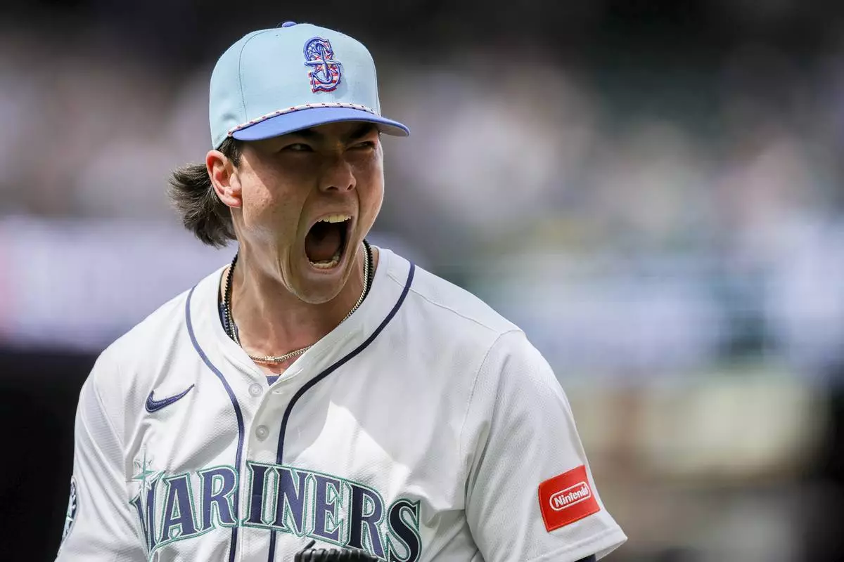 Seattle Mariners starting pitcher Bryan Woo reacts after Pittsburgh Pirates' Nick Gonzales was called out at first base during the sixth inning of a baseball game Friday, July 4, 2025, in Seattle. (AP Photo/Ryan Sun)