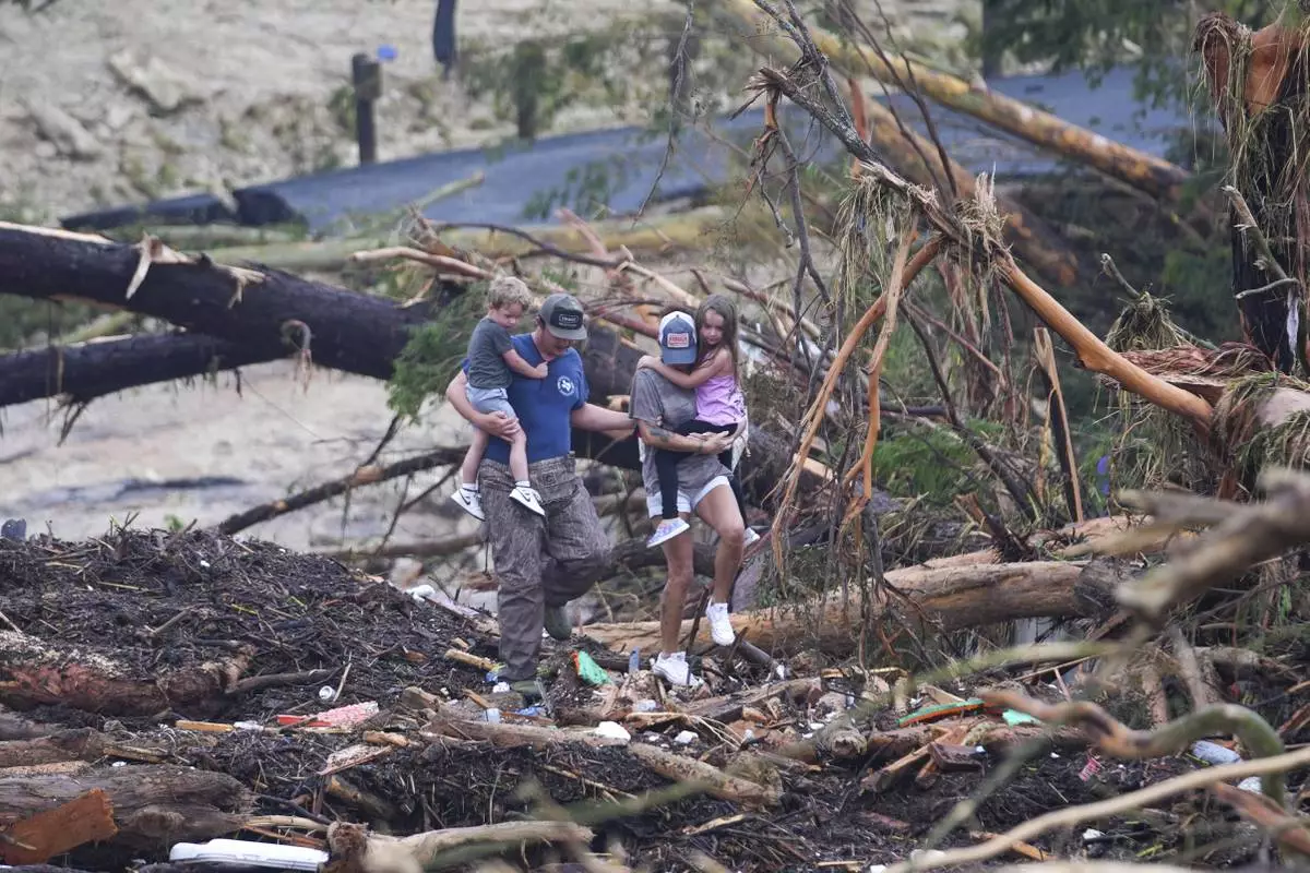 People climb over debris on a bridge atop the Guadalupe River after a flash flood swept through the area Saturday, July 5, 2025, in Ingram, Texas. (AP Photo/Julio Cortez)