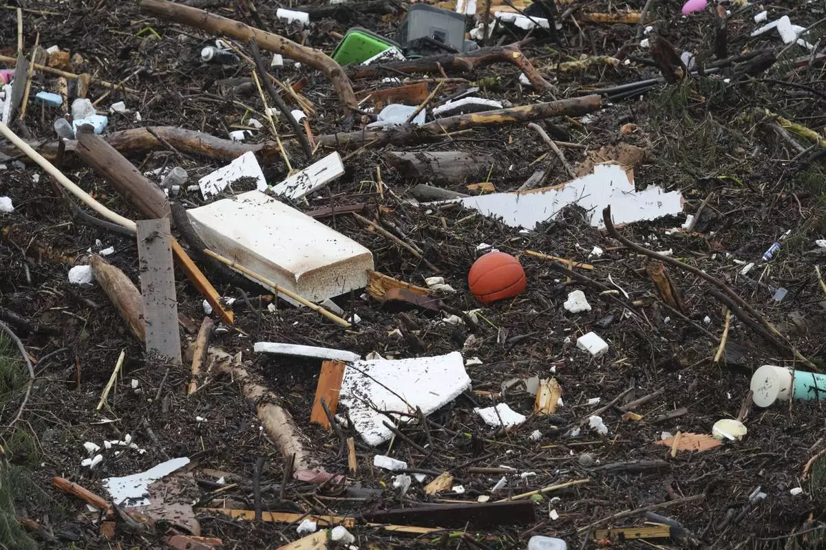 Debris is left behind by a raging Guadalupe River, Friday, July 4, 2025, in Kerrville, Texas. (AP Photo/Eric Gay)