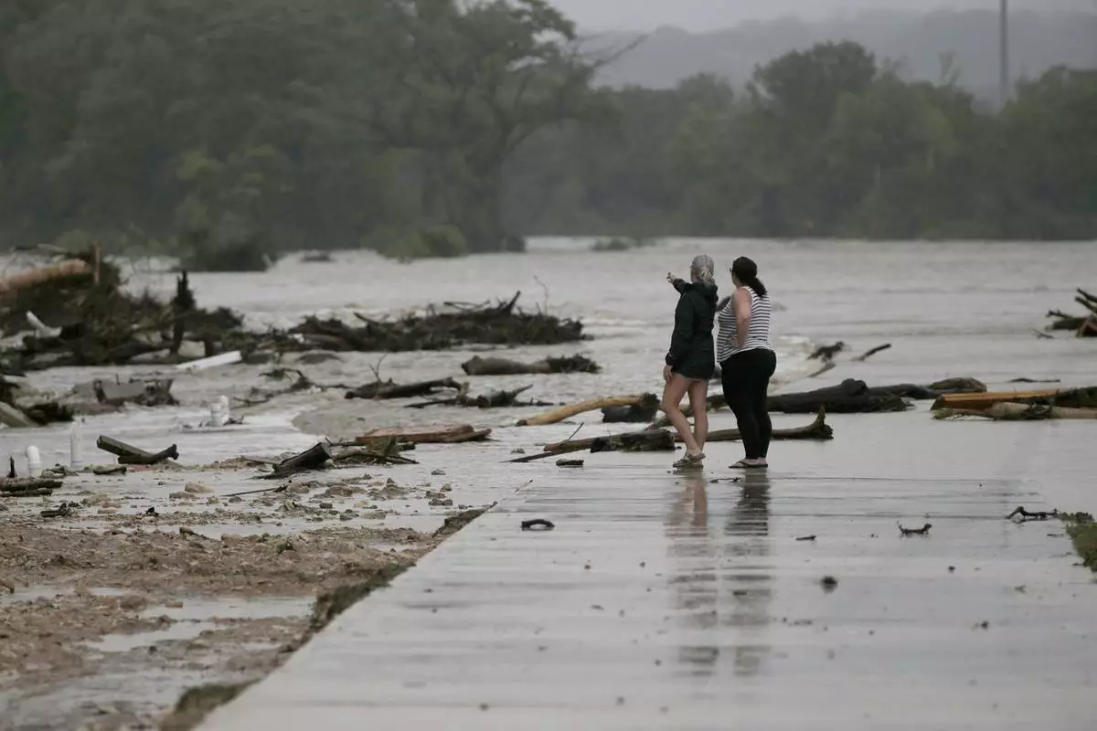 Onlookers survey damage caused along the Guadalupe River after a flash flood swept through the area, Friday, July 4, 2025, in Kerrville, Texas. (AP Photo/Eric Gay)