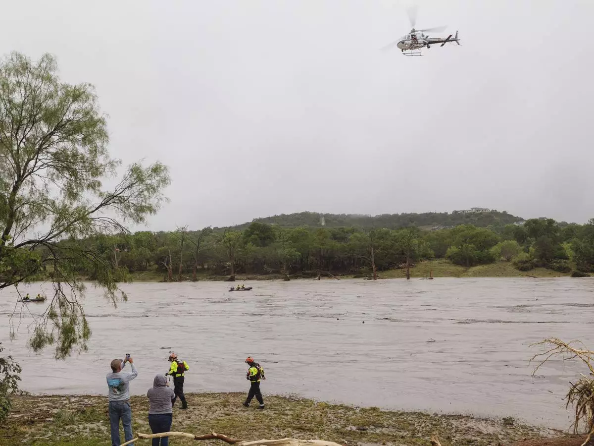 First responders scan the banks of the Guadalupe River for individuals swept away by flooding in Ingram, Texas, Thursday, July 4, 2025. (Michel Fortier/The San Antonio Express-News via AP)