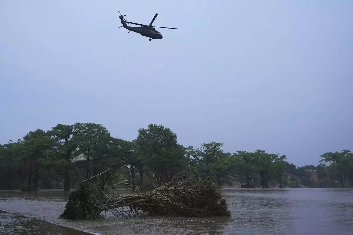 A helicopter flies over the Guadalupe River after a flash flood swept through the area, Friday, July 4, 2025, in Kerrville, Texas. (AP Photo/Eric Gay)