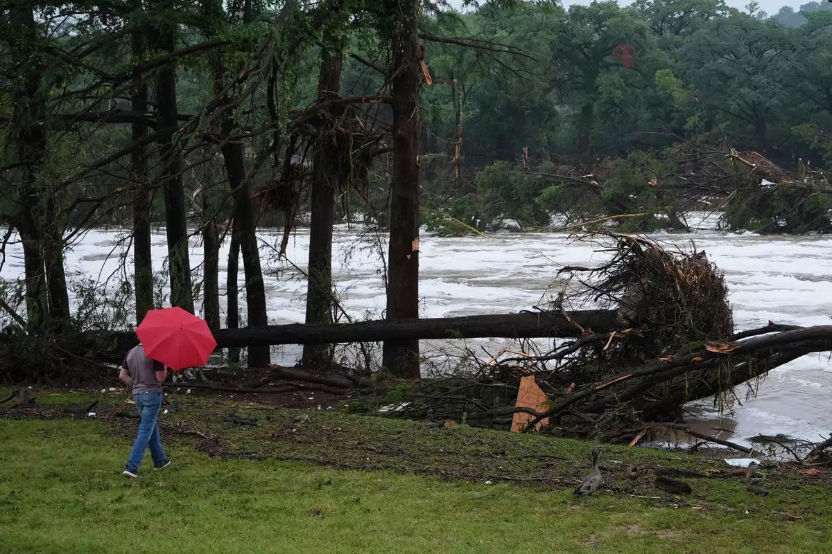 A man surveys debris along the Guadalupe River after a flash flood struck the area, Friday, July 4, 2025, in Kerrville, Texas. (AP Photo/Eric Gay)