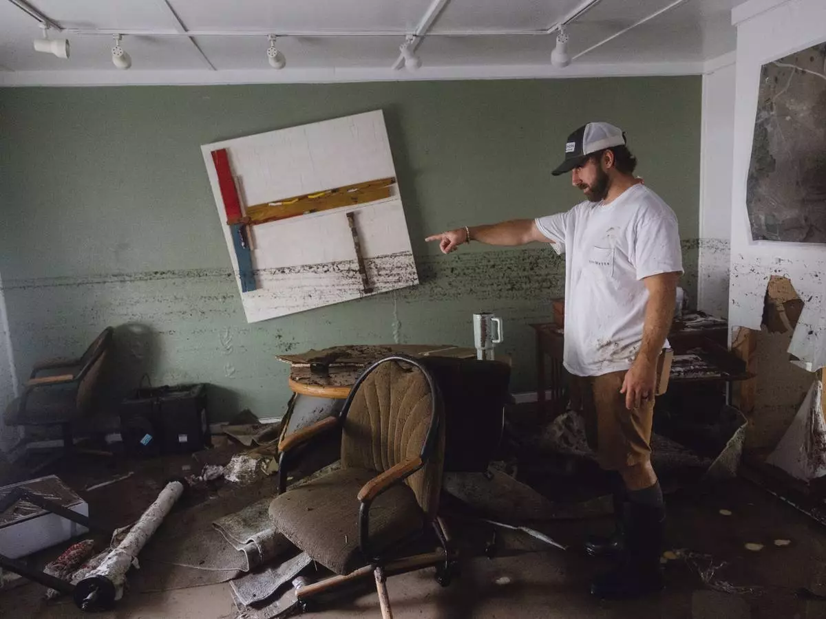 Garrett Burleson shows the damage to the office of his family's architectural business as a dirt line shows the extent of the flooding that the building faced, in Ingram on Friday July 4, 2025. (Christopher Lee/The San Antonio Express-News via AP)