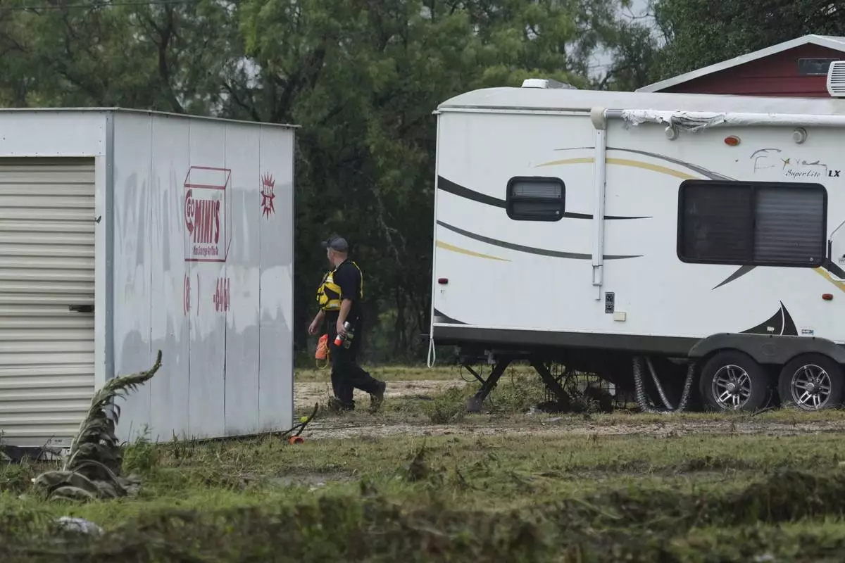 Thomas Rux, a resident of Riverside RV Park, goes through the wreckage of his RV that was swept away by floodwaters in Ingram, Texas, on Friday, July 4, 2025. (Christopher Lee/The San Antonio Express-News via AP)