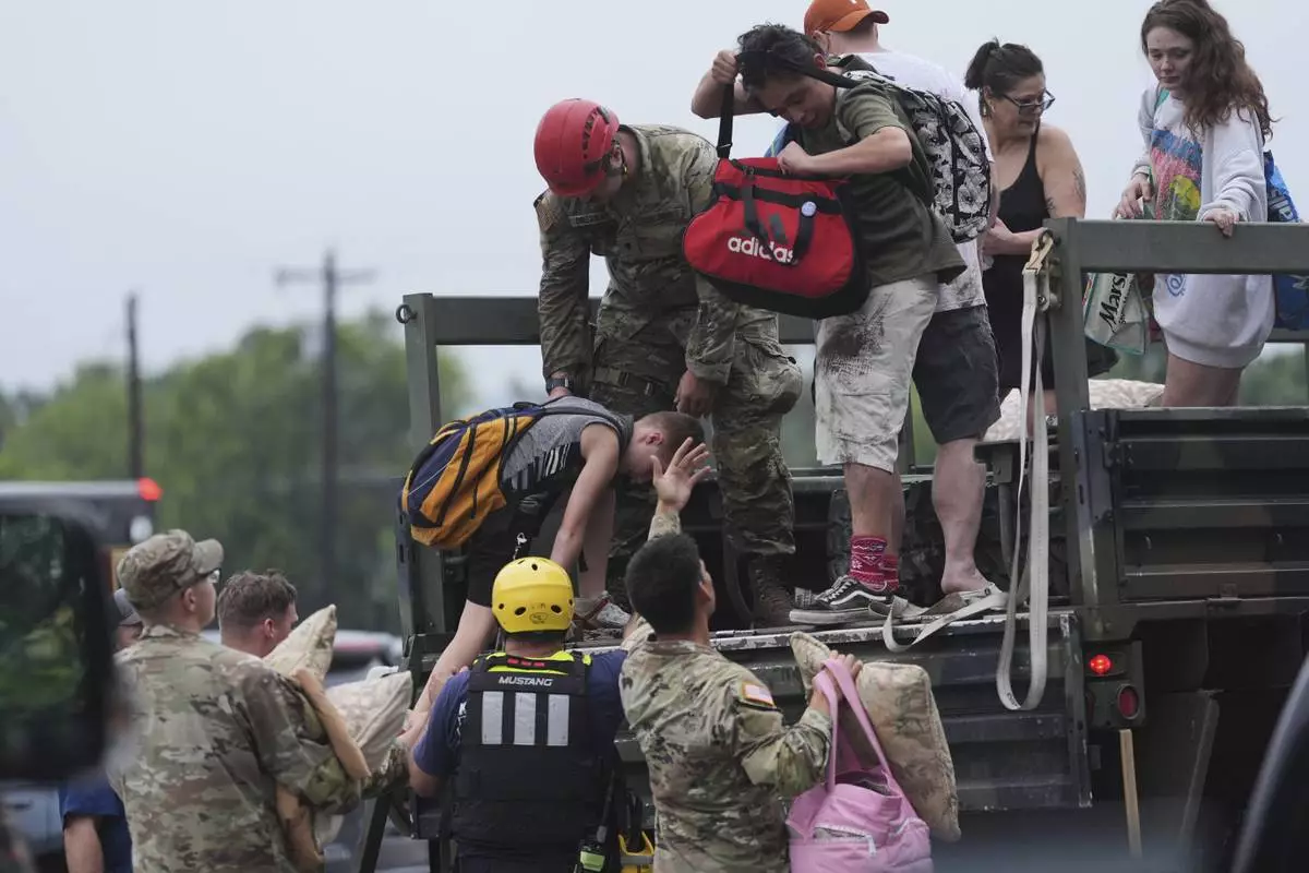 First responders deliver people to a reunification center after flash flooding in the area, Friday, July 4, 2025, in Ingram, Texas. (AP Photo/Eric Gay)