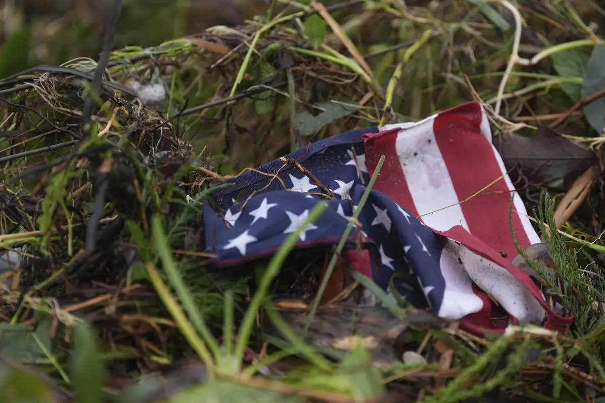 A flag is tangled in debris along the Guyadalupe River after a flash flood struck the area, Friday, July 4, 2025, in Kerrville, Texas. (AP Photo/Eric Gay)