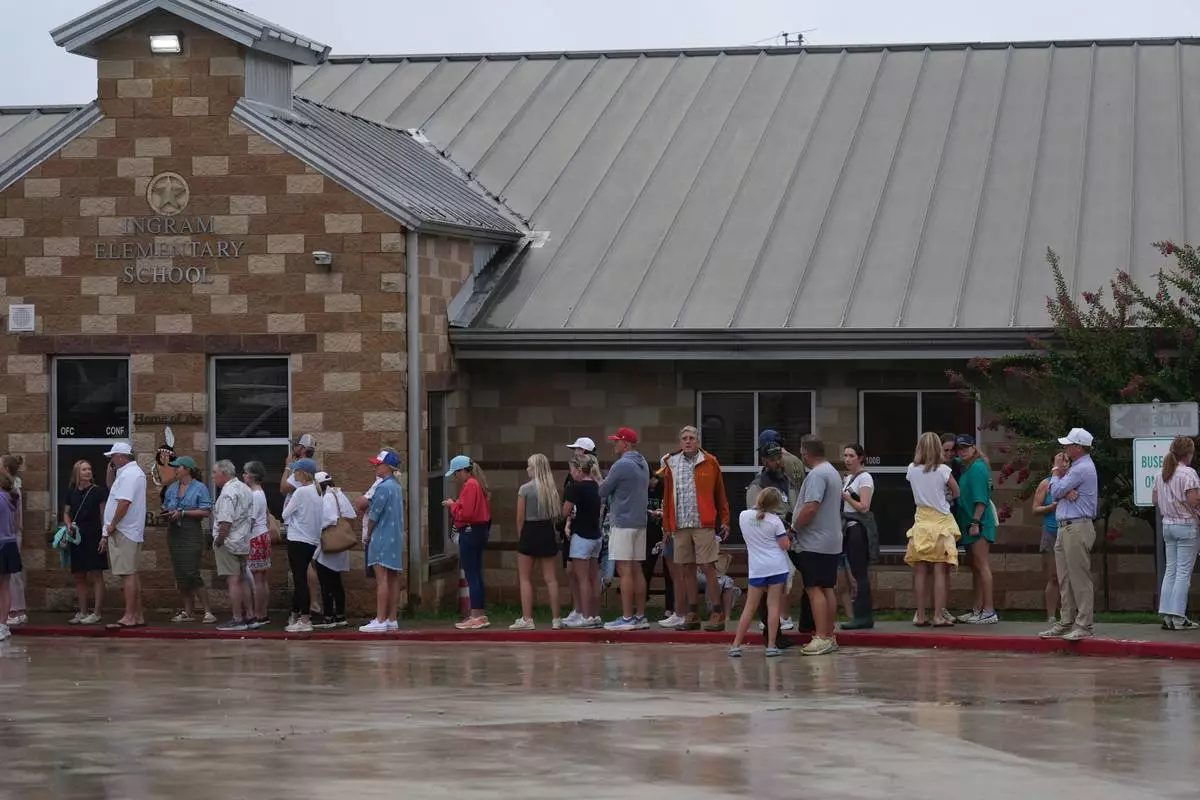 Families line up at a reunification center after flash flooding it the area, Friday, July 4, 2025, in Ingram, Texas. (AP Photo/Eric Gay)