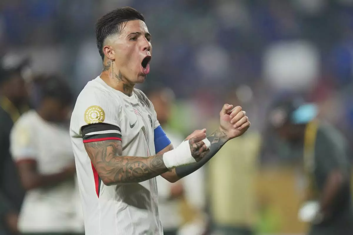 Chelsea's Enzo Fernandez reacts at the end of the Club World Cup quarterfinal soccer match between Palmeiras and Chelsea in Philadelphia, Friday, July 4, 2025. (AP Photo/Chris Szagola)