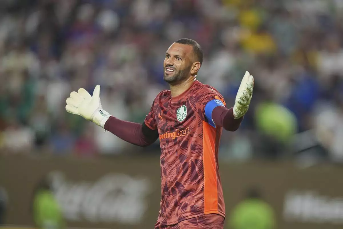 Palmeiras' goalkeeper Weverton gestures during the Club World Cup quarterfinal soccer match between Palmeiras and Chelsea in Philadelphia, Friday, July 4, 2025. (AP Photo/Chris Szagola)