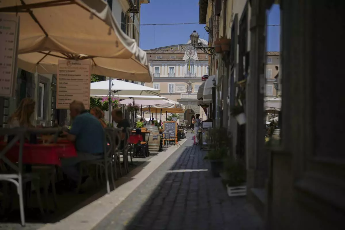 Customers have lunch at restaurants in the town of Castel Gandolfo, a historic summer retreat for popes about 30 kilometers southeast of Rome, where Pope Leo XIV will be spending a short period of rest, as seen Wednesday, July 2, 2025. (AP Photo/Andrew Medichini)