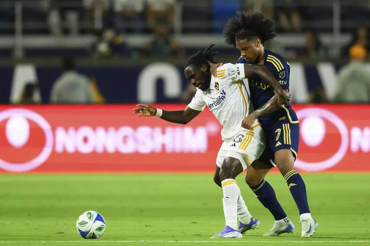 Los Angeles Galaxy forward Joseph Paintsil, left, and Vancouver Whitecaps forward Jayden Nelson vie for the ball during the second half of an MLS soccer match Friday, July 4, 2025, in Carson, Calif. (AP Photo/William Liang)
