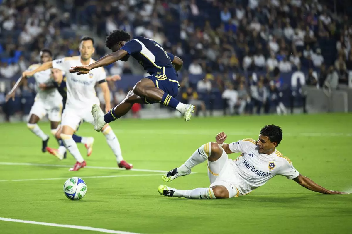 Vancouver Whitecaps forward Emmanuel Sabbi, center, jumps over Los Angeles Galaxy midfielder Edwin Cerrillo, right, during the first half of an MLS soccer match Friday, July 4, 2025, in Carson, Calif. (AP Photo/William Liang)