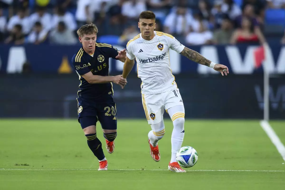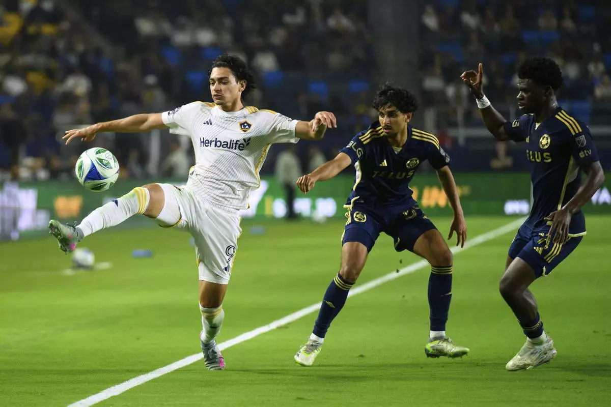 Los Angeles Galaxy forward Matheus Nascimento, left, controls the ball during the second half of an MLS soccer match against the Vancouver Whitecaps Friday, July 4, 2025, in Carson, Calif. (AP Photo/William Liang)