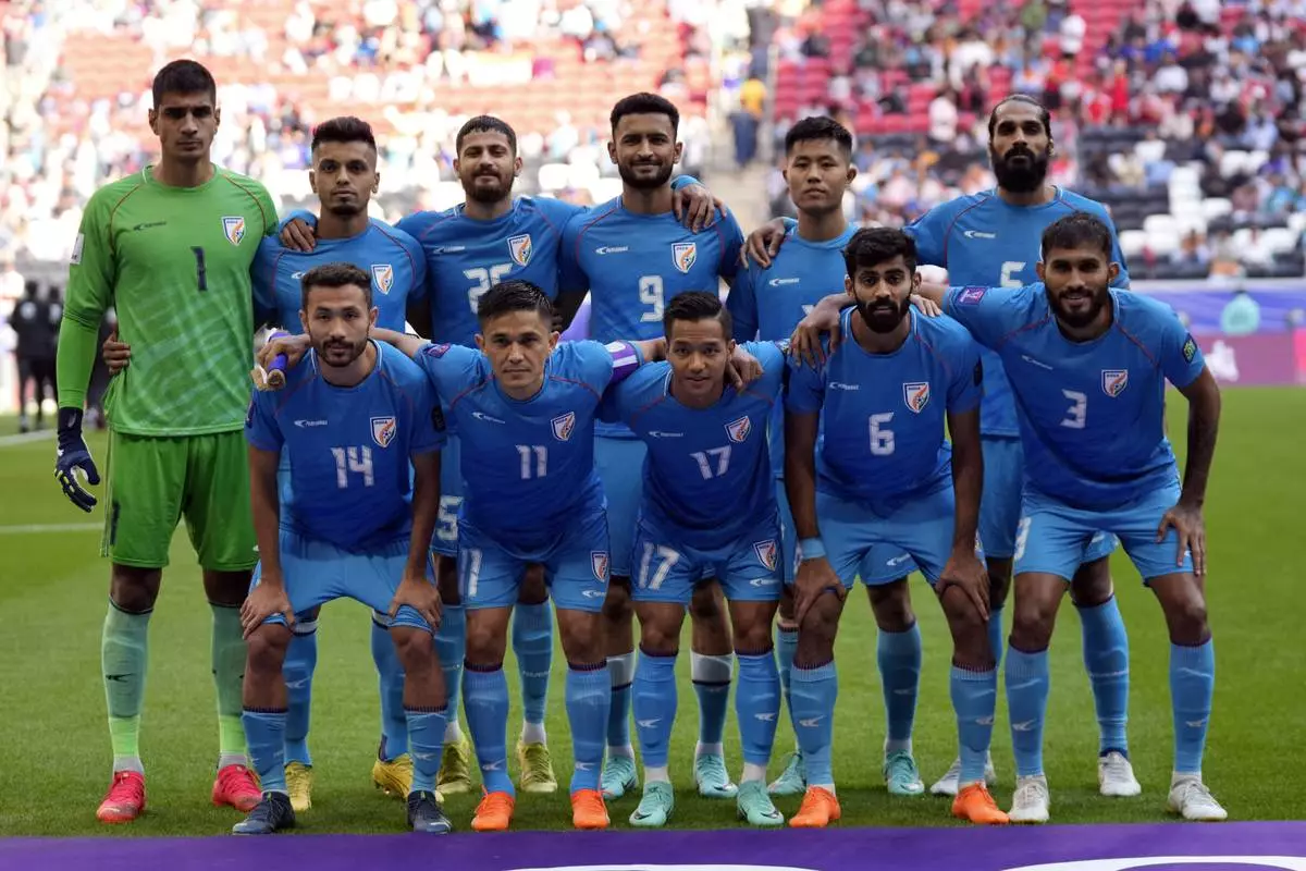 FILE -The India National team pose for a group photo prior to the Asian Cup Group B soccer match between Syria and India at Al Bayt Stadium in Al Khor, Qatar, Jan. 23, 2024. (AP Photo/Aijaz Rahi), File)