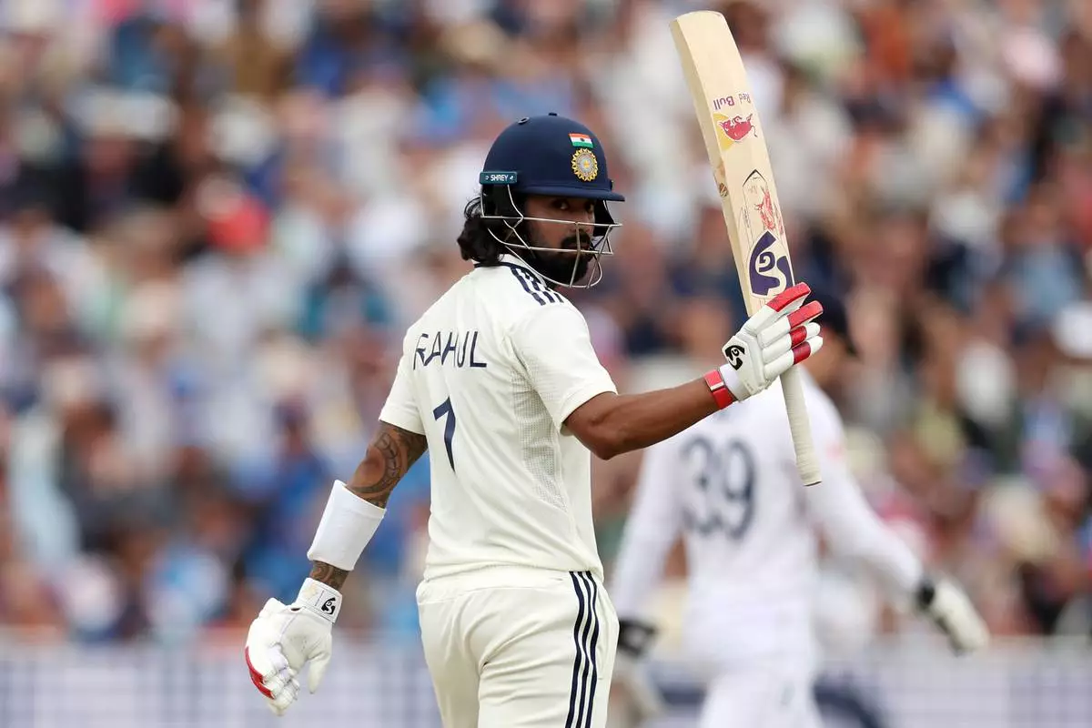 India's KL Rahul celebrates after scoring fifty runs duringday four of the second cricket test match between England and India at Edgbaston in Birmingham, England, Saturday, July 5, 2025. (AP Photo/Scott Heppell)