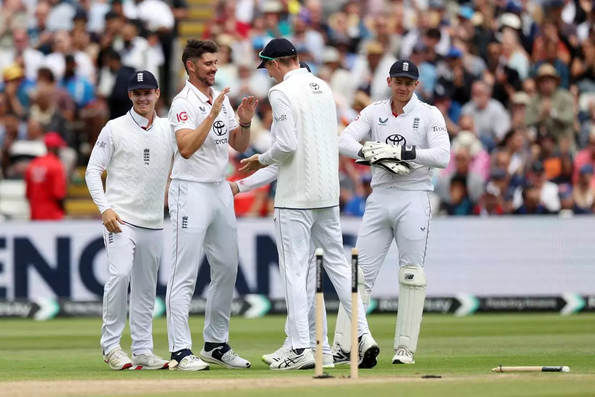 England's Josh Tongue celebrates with his teammamtes after bowling out India's KL Rahul during day four of the second cricket test match between England and India at Edgbaston in Birmingham, England, Saturday, July 5, 2025. (AP Photo/Scott Heppell)
