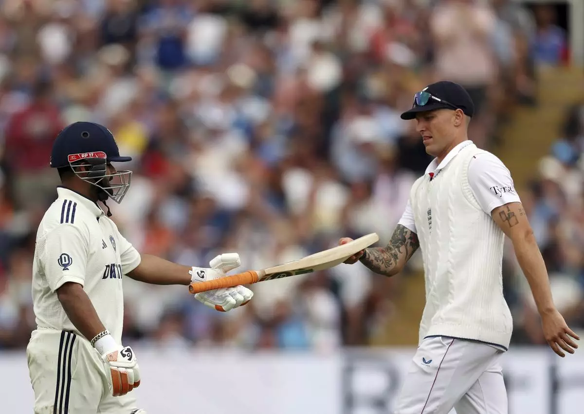 India's Rishabh Pant, left, is given his bat back by England's Brydon Carse during day four of the second cricket test match between England and India at Edgbaston in Birmingham, England, Saturday, July 5, 2025. (AP Photo/Scott Heppell)