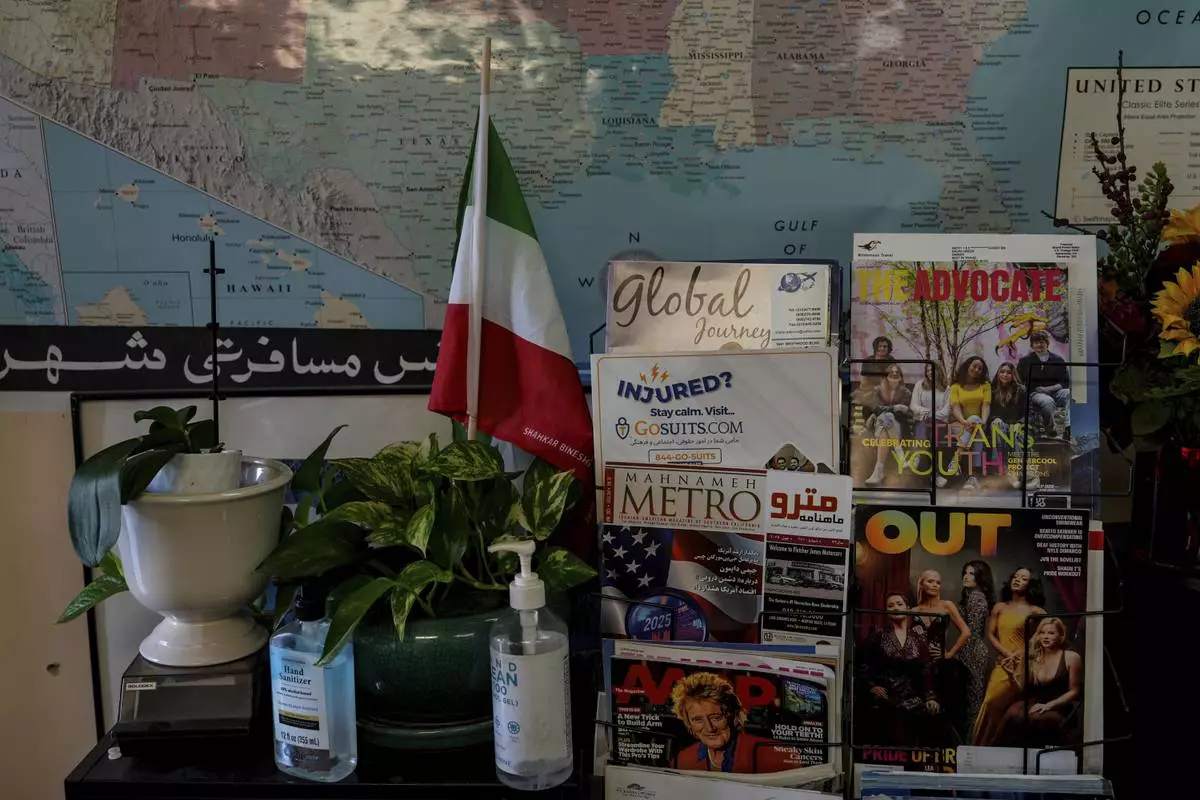 An Iranian flag is seen next to a magazine rack at Shahrzad Tahouri's travel agency in the "Tehrangeles" neighborhood of Los Angeles Tuesday, June 24, 2025. (AP Photo/Jae C. Hong)