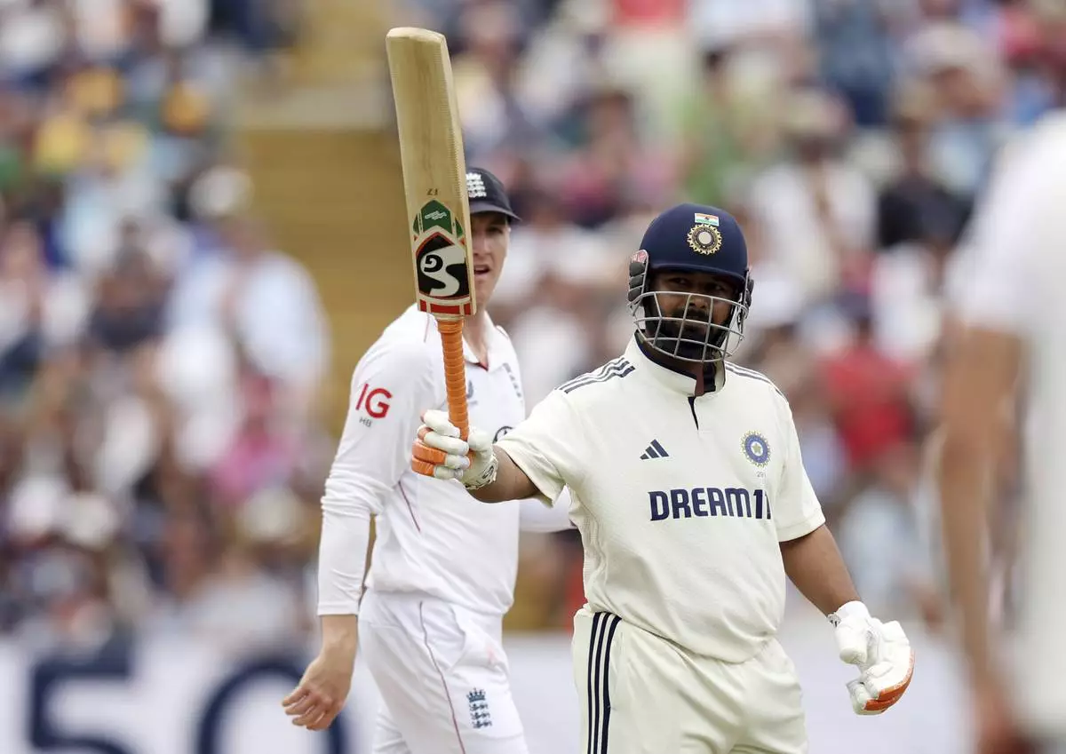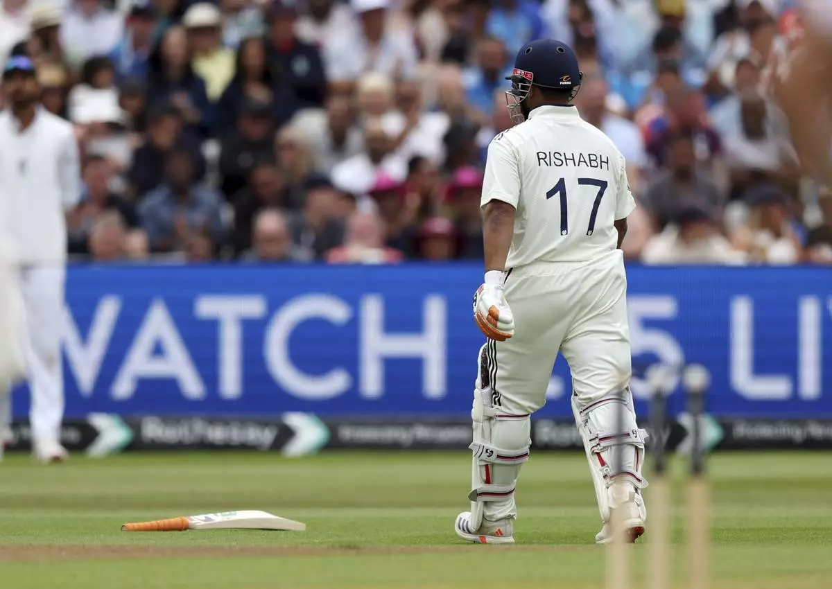 Attempting to pull offspinner Shoaib Bashir for six, Pant miscued his shot while also letting go of his bat, which flew toward midwicket — close to England fielder Brydon Carse. Meanwhile, the ball looped high in the air and into the deep on the offside where it was caught by Ben Duckett.