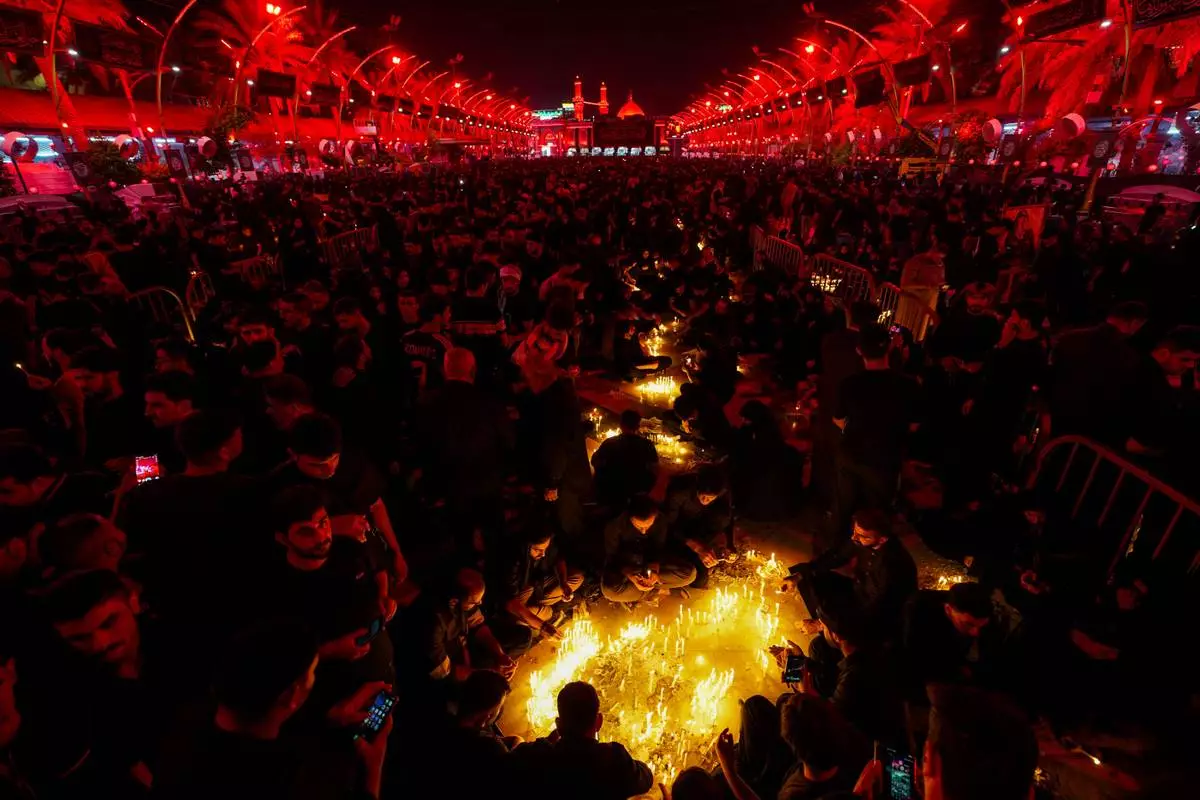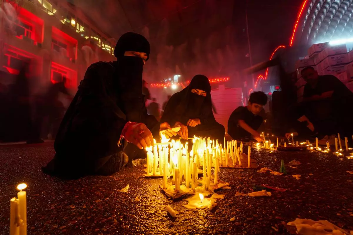 Shiite faithful pilgrims light candles outside the holy shrine of Imam Hussein during a Muharram procession marking Ashoura, to commemorate the martyrdom of Imam Hussein, grandson of the Prophet Muhammad, in Karbala, Iraq, Sunday, July 6, 2025. (AP Photo/Anmar Khalil)