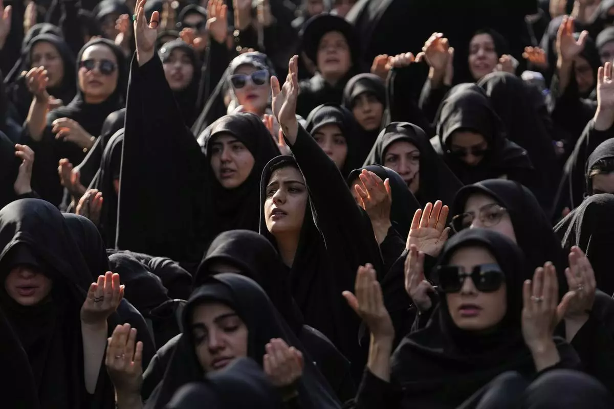 Iranian Shiite Muslims pray in a mourning ceremony in Tehran, Iran, Friday, July 4, 2025, ahead of Ashoura, a remembrance of the 7th-century martyrdom of the Prophet Muhammad's grandson, Hussein, who was killed in a battle in Karbala in present-day Iraq. (AP Photo/Vahid Salemi)