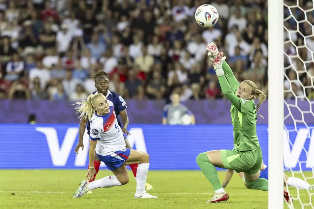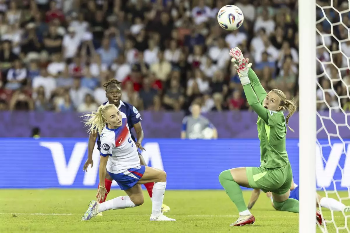 England's goalkeeper Hannah Hampton, right, fails to save a goal by France's Sandy Baltimore, back, next to England's Alex Greenwood, left, during the UEFA Women's EURO 2025 Group D soccer match between France and England at the Letzigrund stadium in Zurich, Switzerland, on Saturday, July 5, 2025. (Michael Buholzer/Keystone via AP)