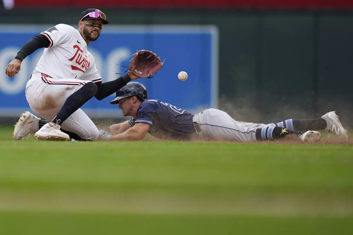 Tampa Bay Rays' Jake Mangum (28) beats the throw to Minnesota Twins shortstop Carlos Correa (4) to reach second base after a wild pitch by Minnesota Twins relief pitcher Travis Adams (45) during the sixth inning of a baseball game Saturday, July 5, 2025, in Minneapolis. (AP Photo/Abbie Parr)