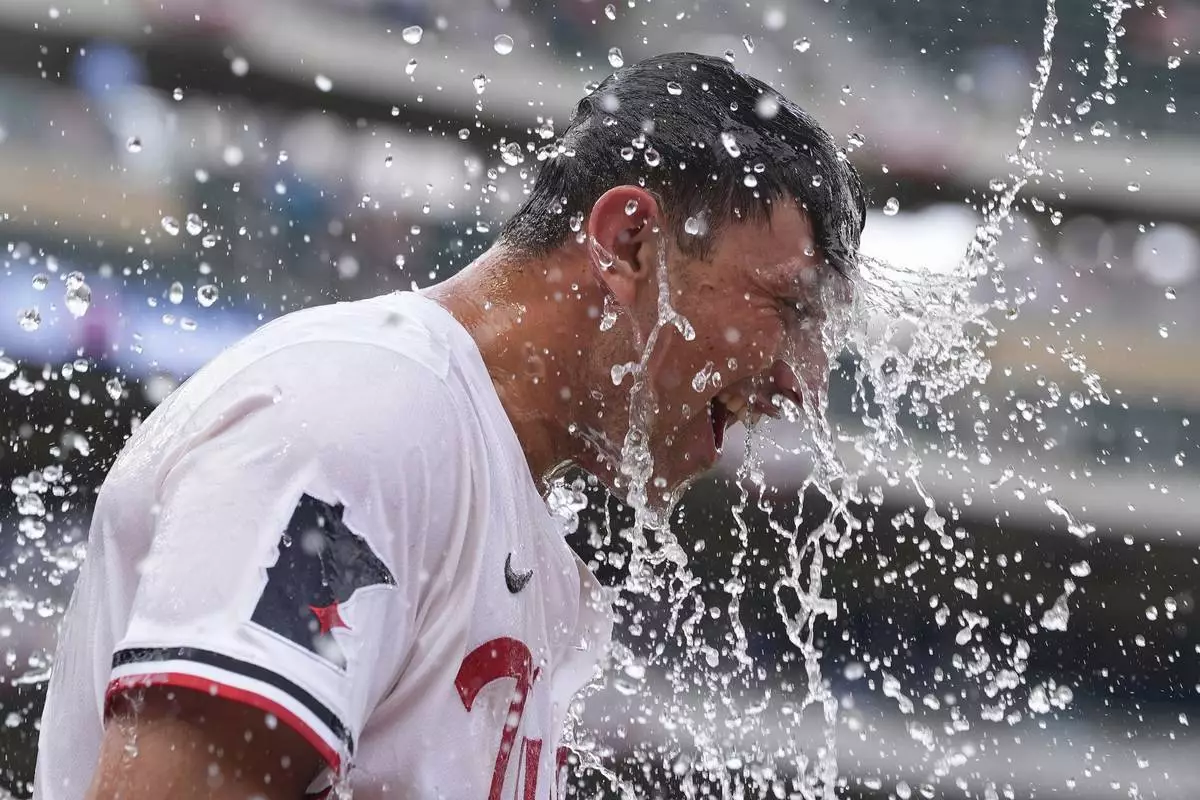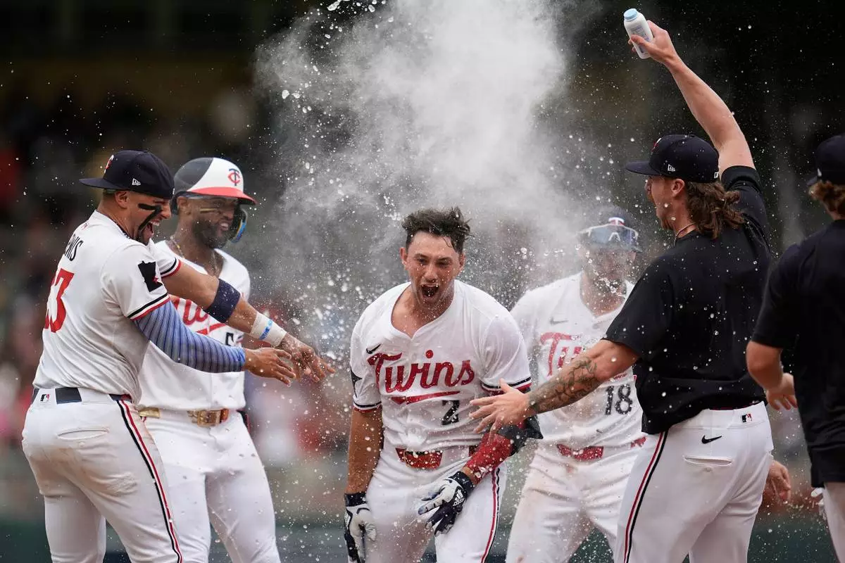 Minnesota Twins' Brooks Lee is doused after reaching on a winning infield RBI bunt to score teammate Byron Buxton during the ninth inning of a baseball game against the Tampa Bay Rays, Saturday, July 5, 2025, in Minneapolis. (AP Photo/Abbie Parr)