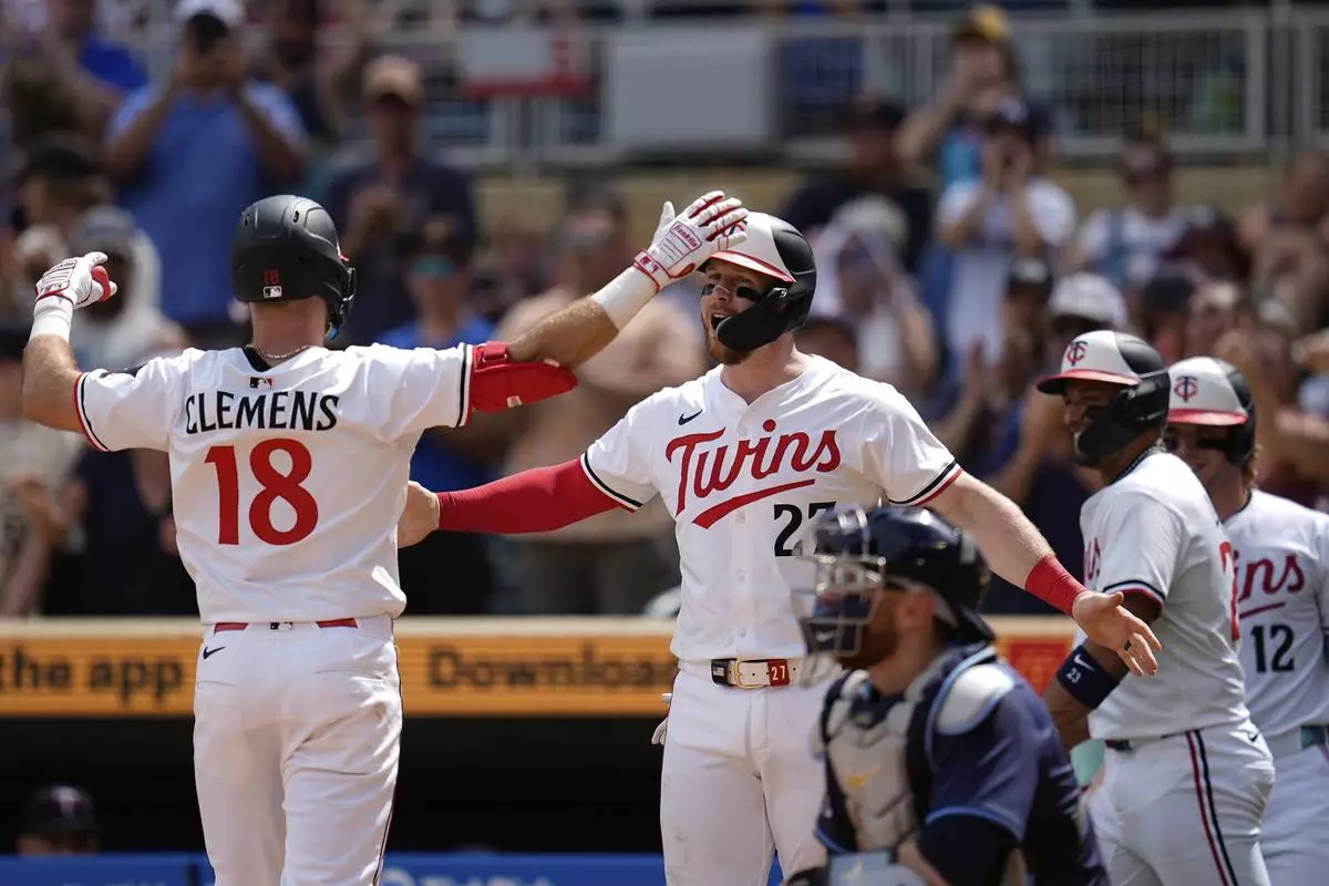 Minnesota Twins' Kody Clemens (18), back, left, celebrates with teammates after hitting a 3-run home run during the sixth inning of a baseball game against the Tampa Bay Rays Saturday, July 5, 2025, in Minneapolis. (AP Photo/Abbie Parr)