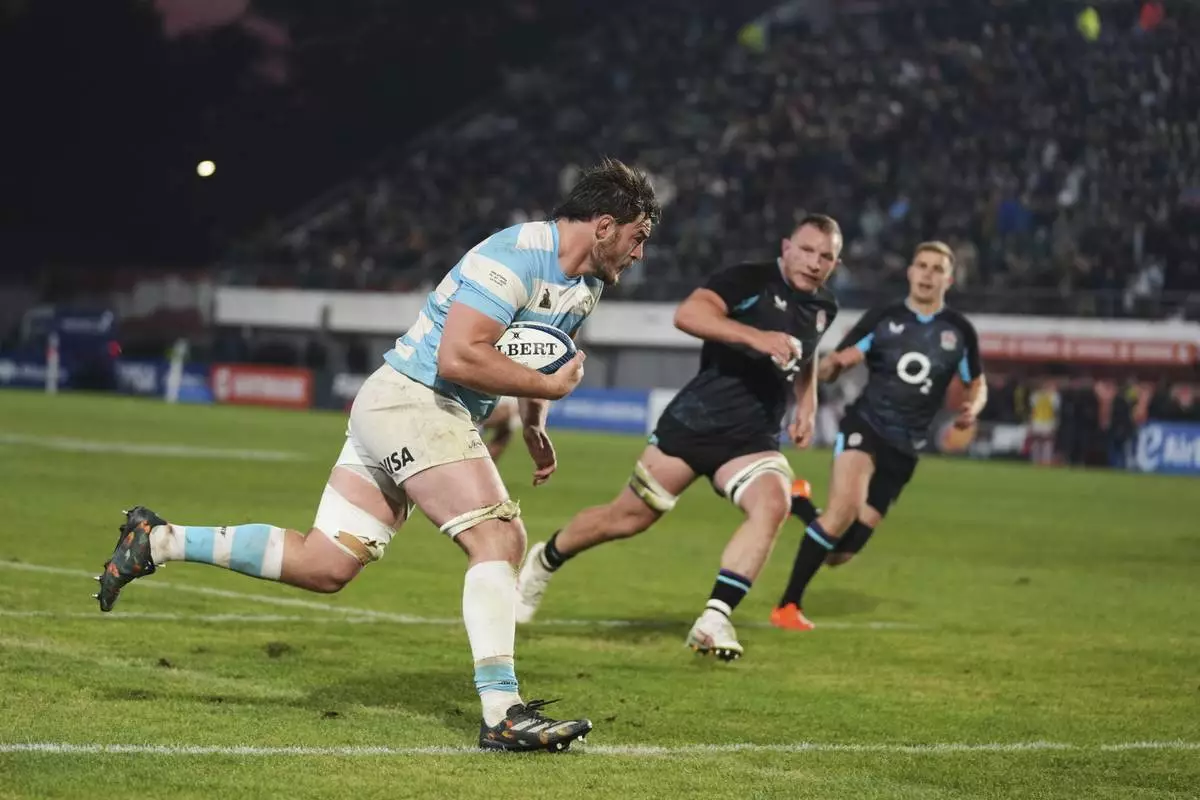 Argentina's Pedro Rubiolo runs to score a try against England during a rugby test match in La Plata, Argentina, Saturday, July 5, 2025. (AP Photo/Gustavo Garello)